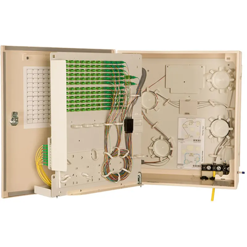 and is designed for NEMA 12 performance. The FDH is sizeoptimized by leveraging the very compact PLC Splitter. Its flexible design supports either mass fusion splicing in the field or rapid connection through multifiber push-on (MPO) terminations. The mounting hardware is re-configurable to support a variety of wall mounting scenarios in both Greenfield and Brownfield deployments. The FDH is also designed to be installed by a single technician.